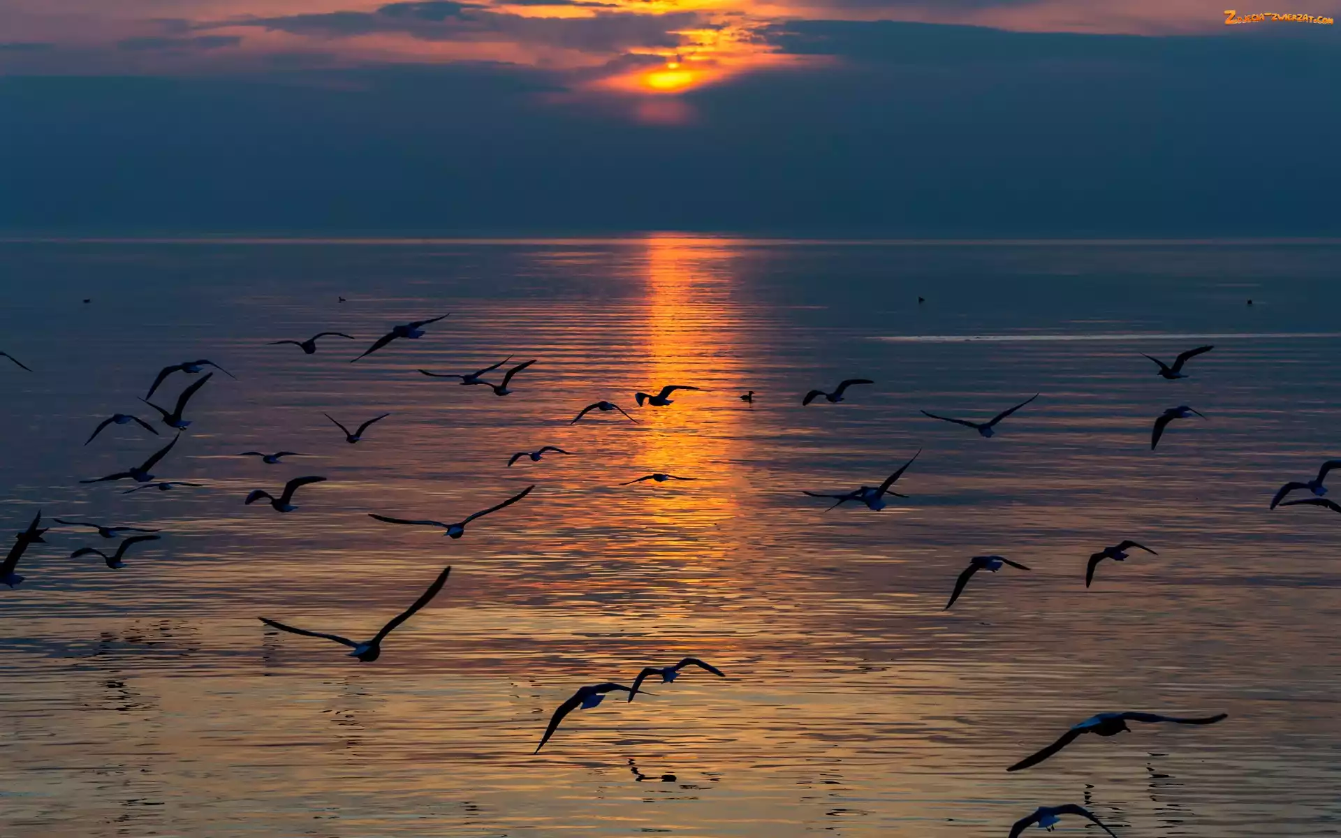 Ptaki, Zachód Słońca, Morze, Mewy