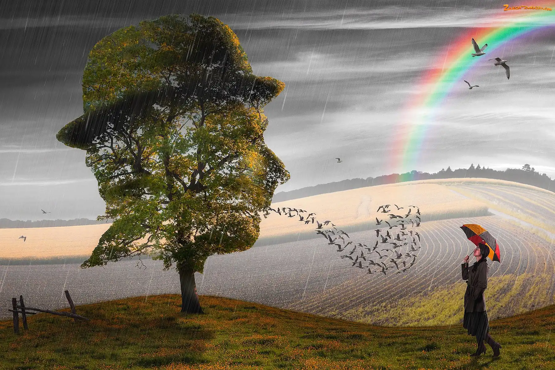 Zdjęcie: Parasolka, Ptaki, Grafika, Dziewczyna, Deszcz, Drzewo, Tęcza