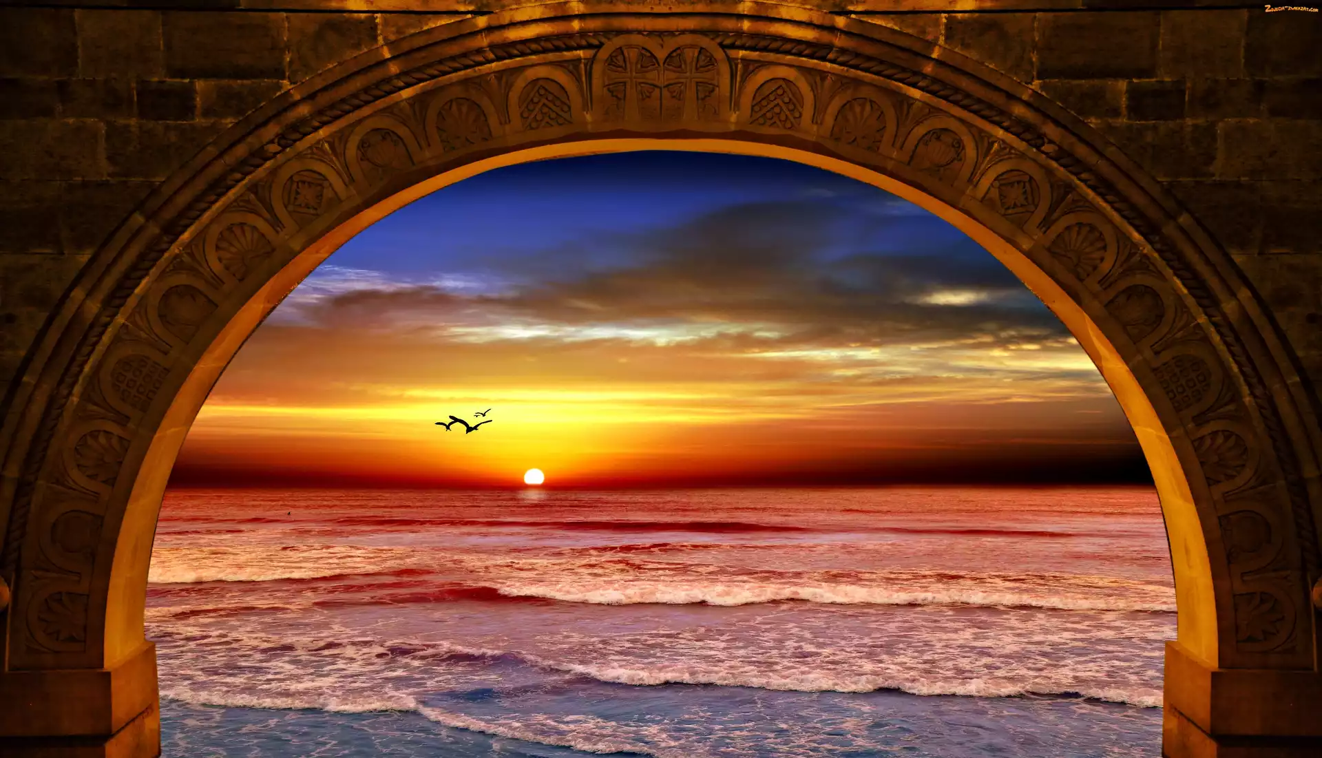 Ptaki, Słońca, Morze, Łuk, Zachód