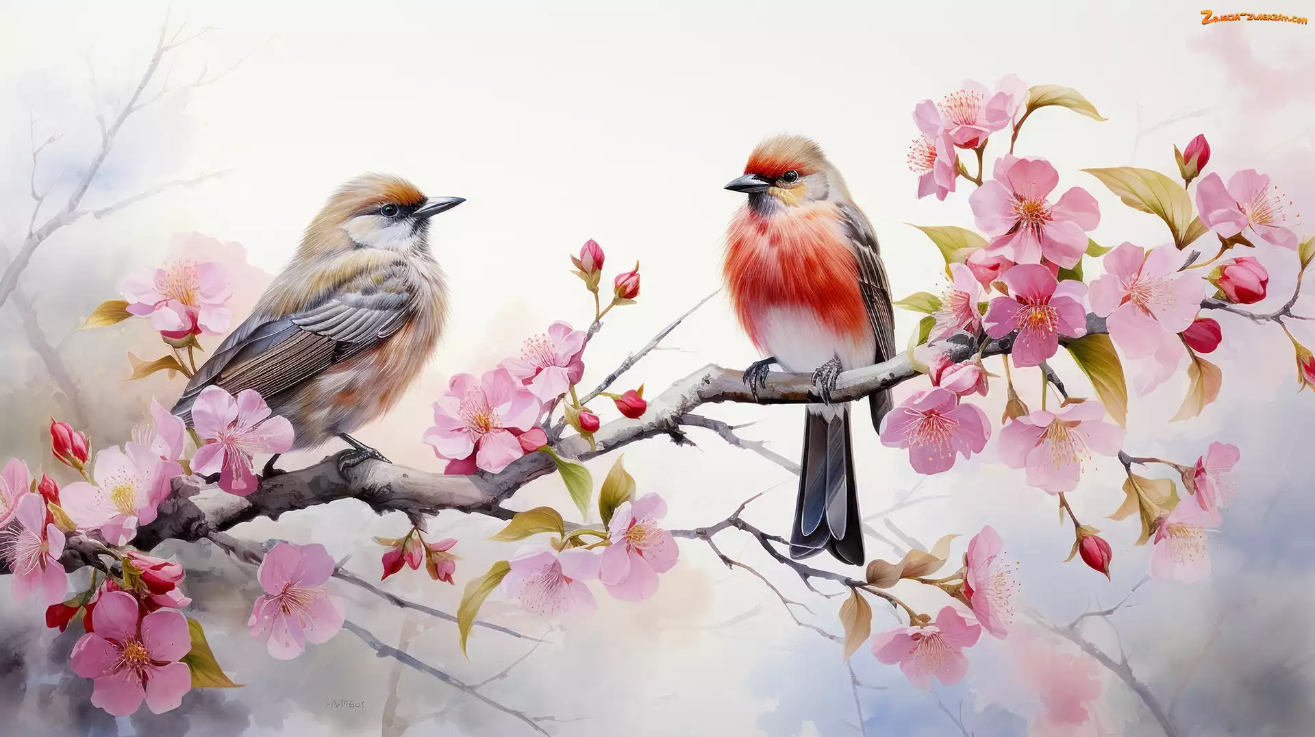 Zdjęcie: Grafika, Gałąź, Kolorowe, Ptaki, Kwiaty, Wiosna