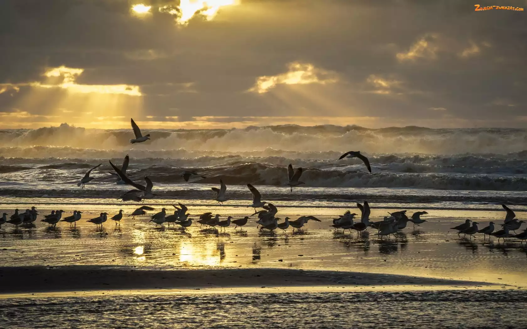 Zdjęcie: Ptaki, Morze, Słońca, Zachód, Promienie
