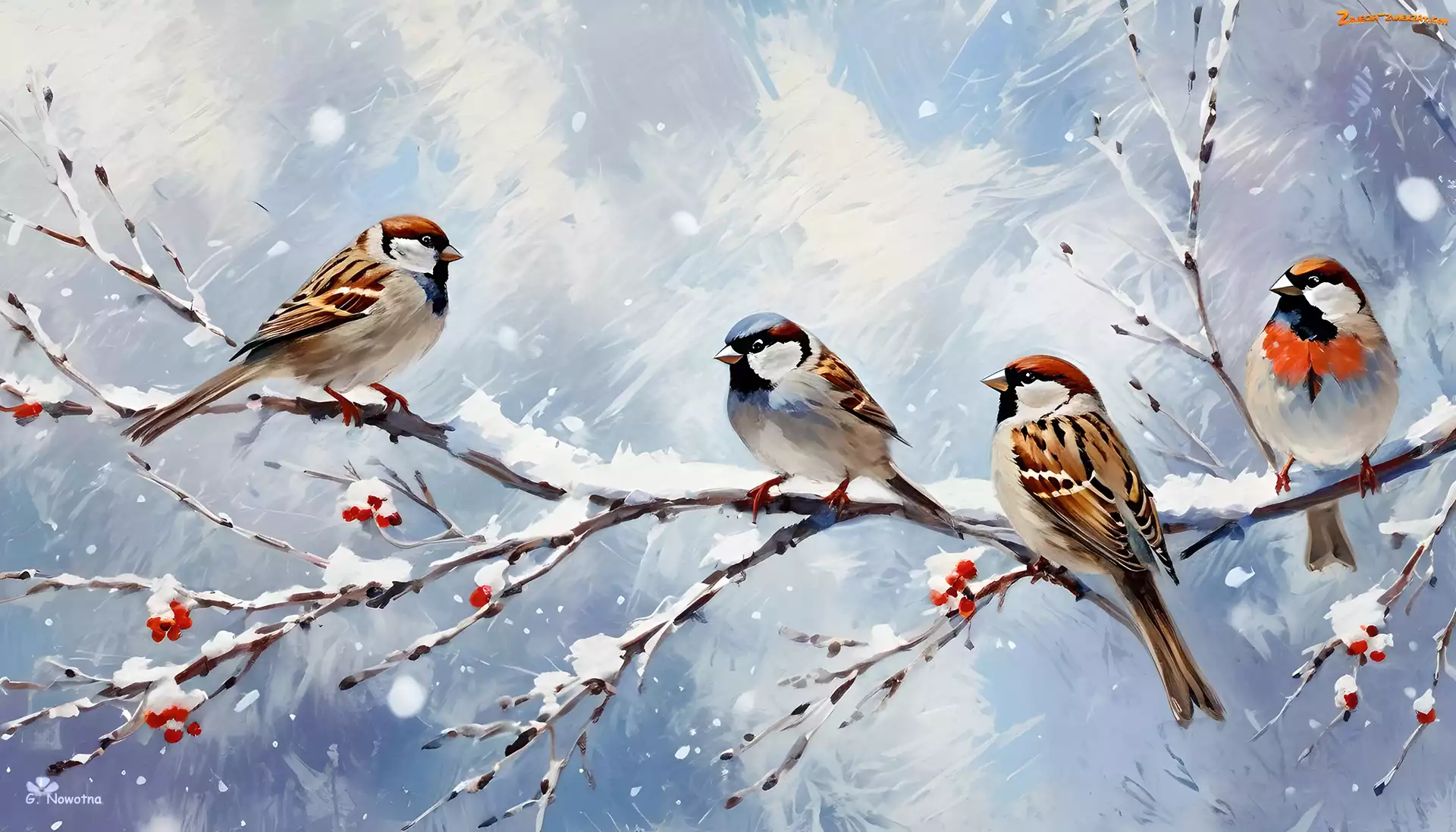 Zdjęcie: Grafika, Gałązka, Cztery, Ptaki, Śnieg, Zima