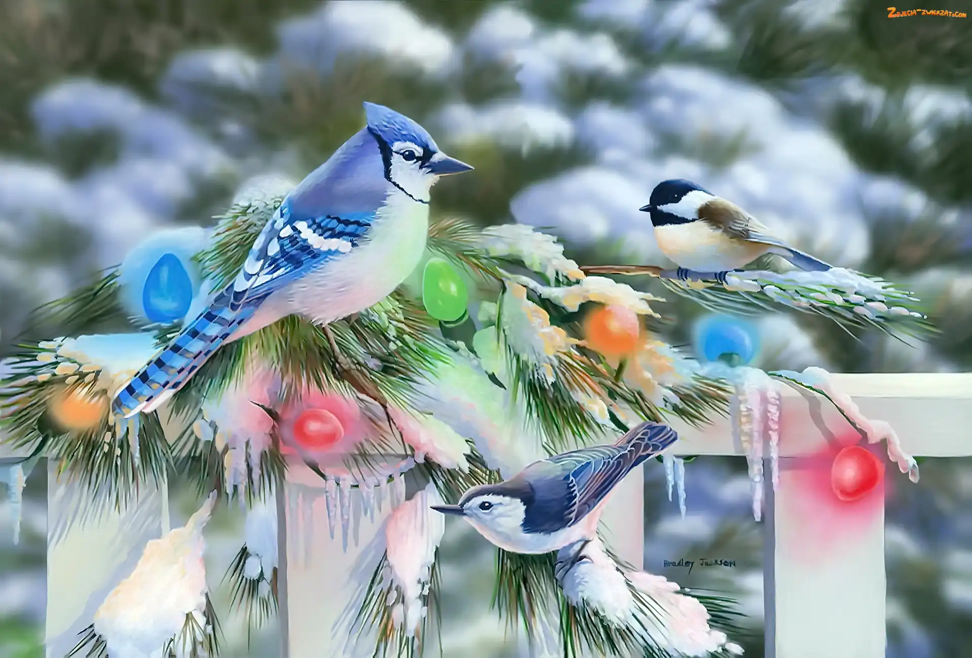 Zdjęcie: Ptaki, Światełka, Zima, Płot