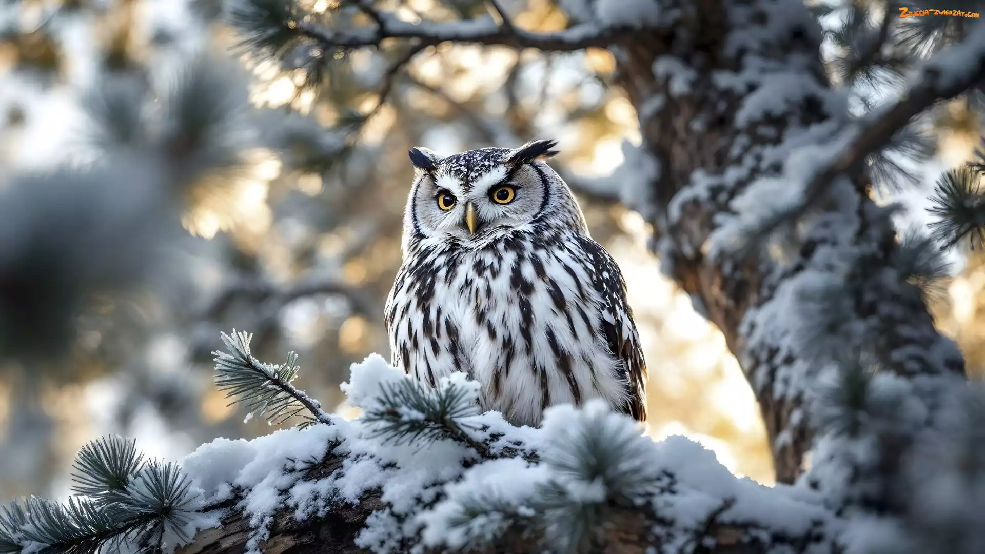 Zdjęcie: Gałęzie, Ośnieżone, Sowa, Puchacz, Drzewo, Sosna