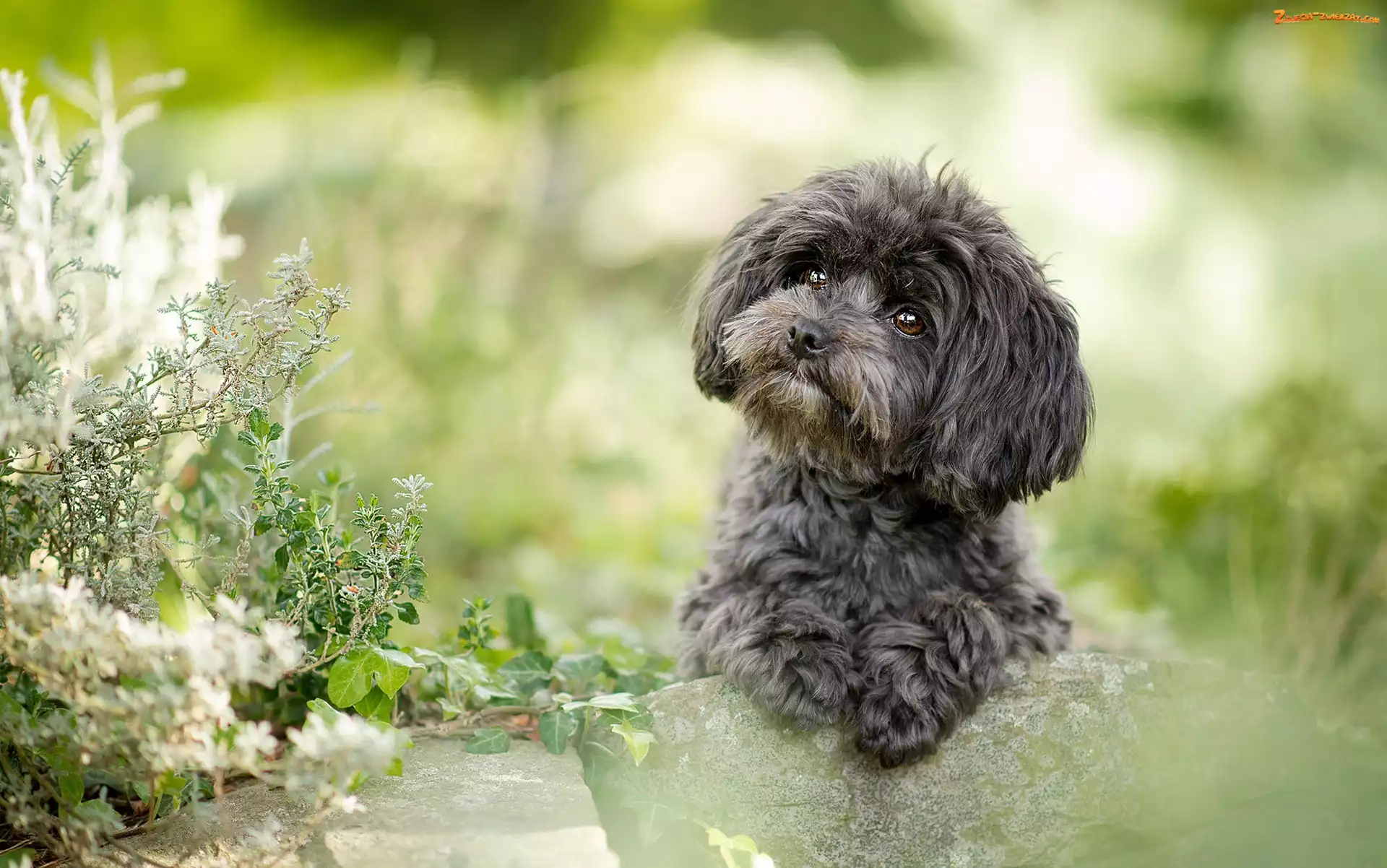 Zdjęcie: Pudel toy, Kamień, Pies, Rośliny