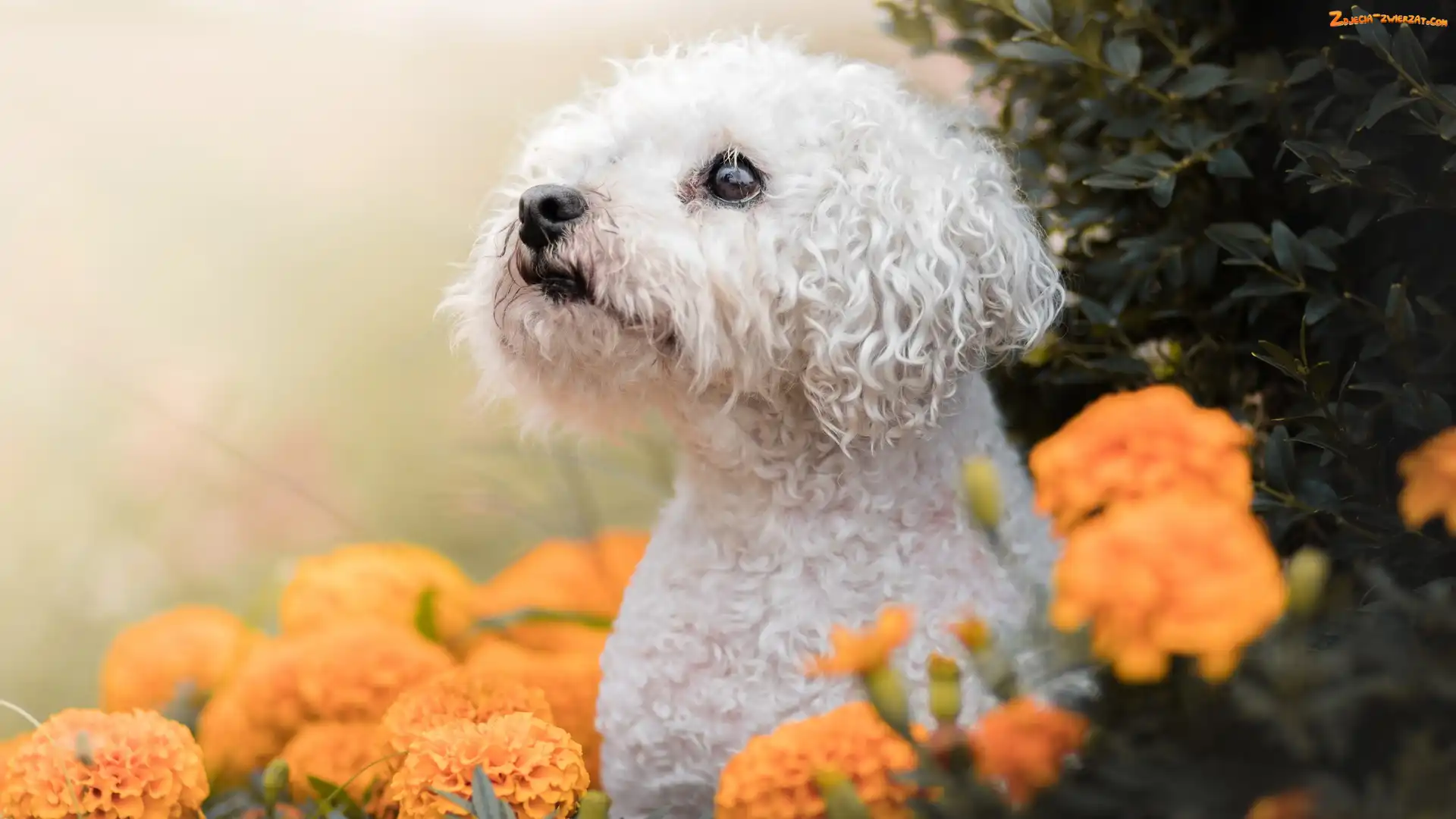 Zdjęcie: Pudel, Aksamitki wzniesione, Pies, Kwiaty