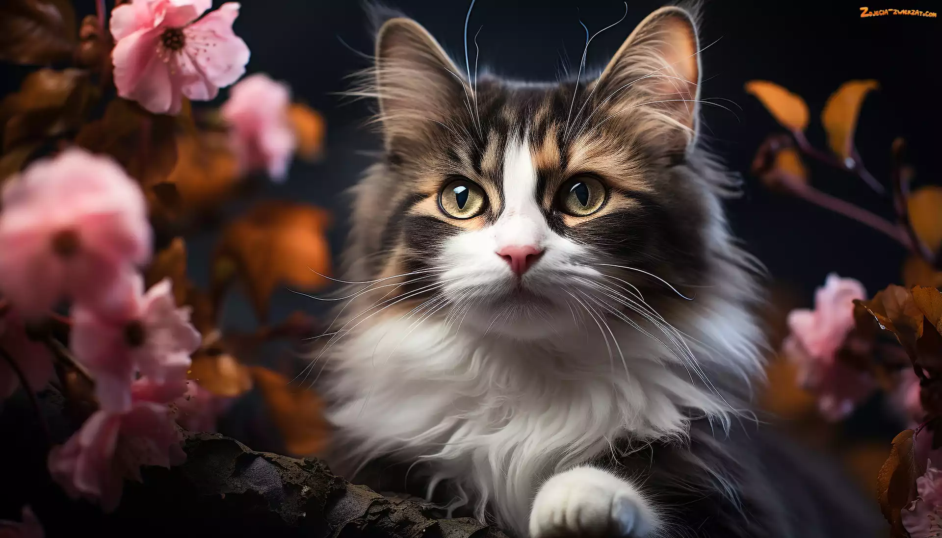 Zdjęcie: Długowłosy, Kot, Kwiaty, Pyszczek