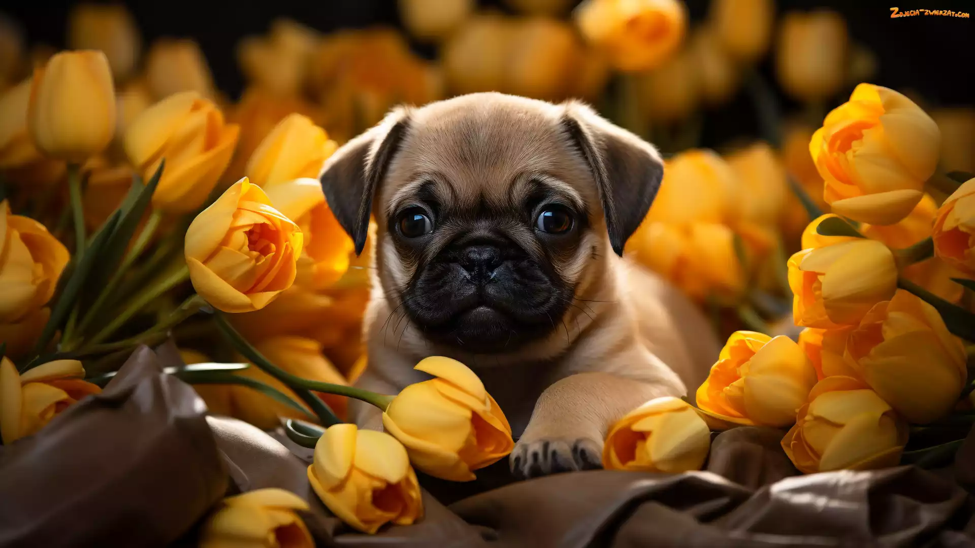 Zdjęcie: Kwiaty, Pies, Szczeniak, Pyszczek, Tulipany, Mops, Żółte