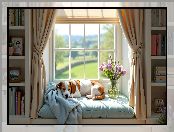 Regał, Kwiatów, Książki, Okno, Grafika AI, Pies, Bukiet, Leżący
