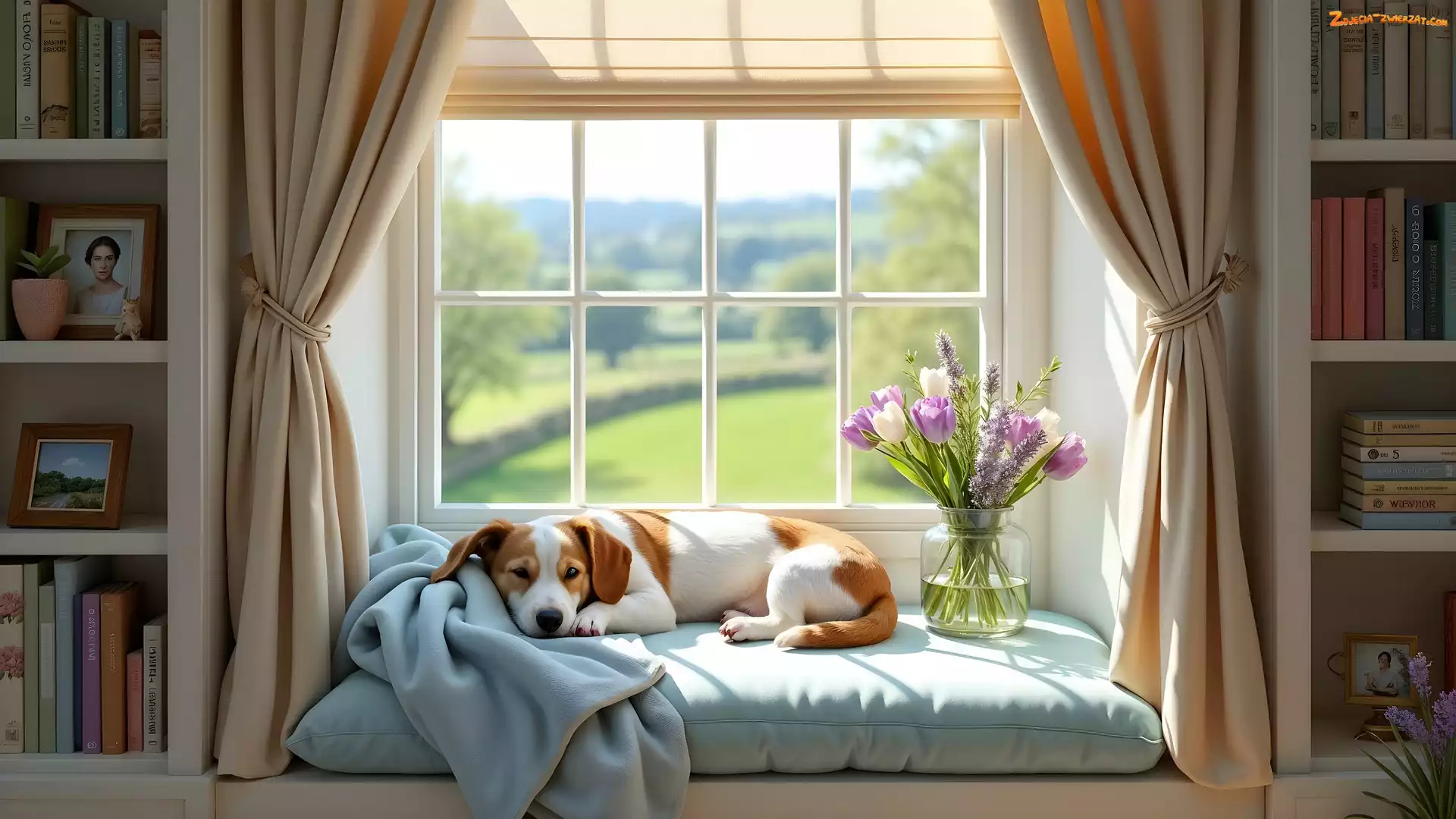 Zdjęcie: Regał, Kwiatów, Książki, Okno, Grafika AI, Pies, Bukiet, Leżący