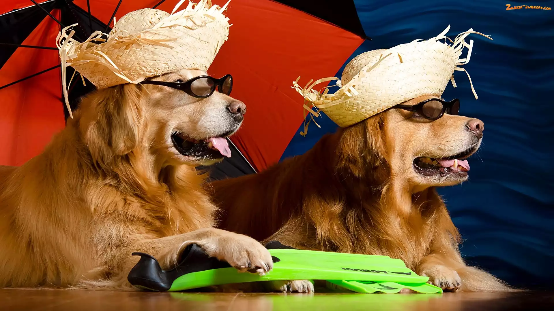 Zdjęcie: Golden retriever, Dwa, Okulary, Kapelusze, Psy, Parasol