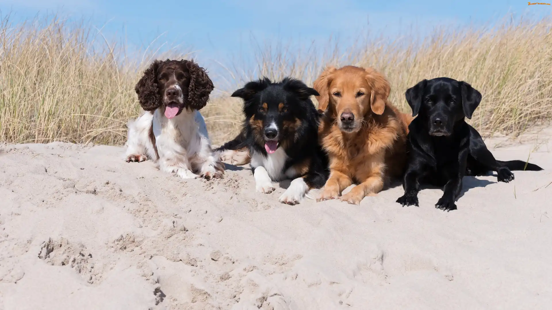 Zdjęcie: Border collie, Trawa, Golden retriever, Cztery, Piasek, Plaża, Spaniel angielski, Psy, Labrador retriever |