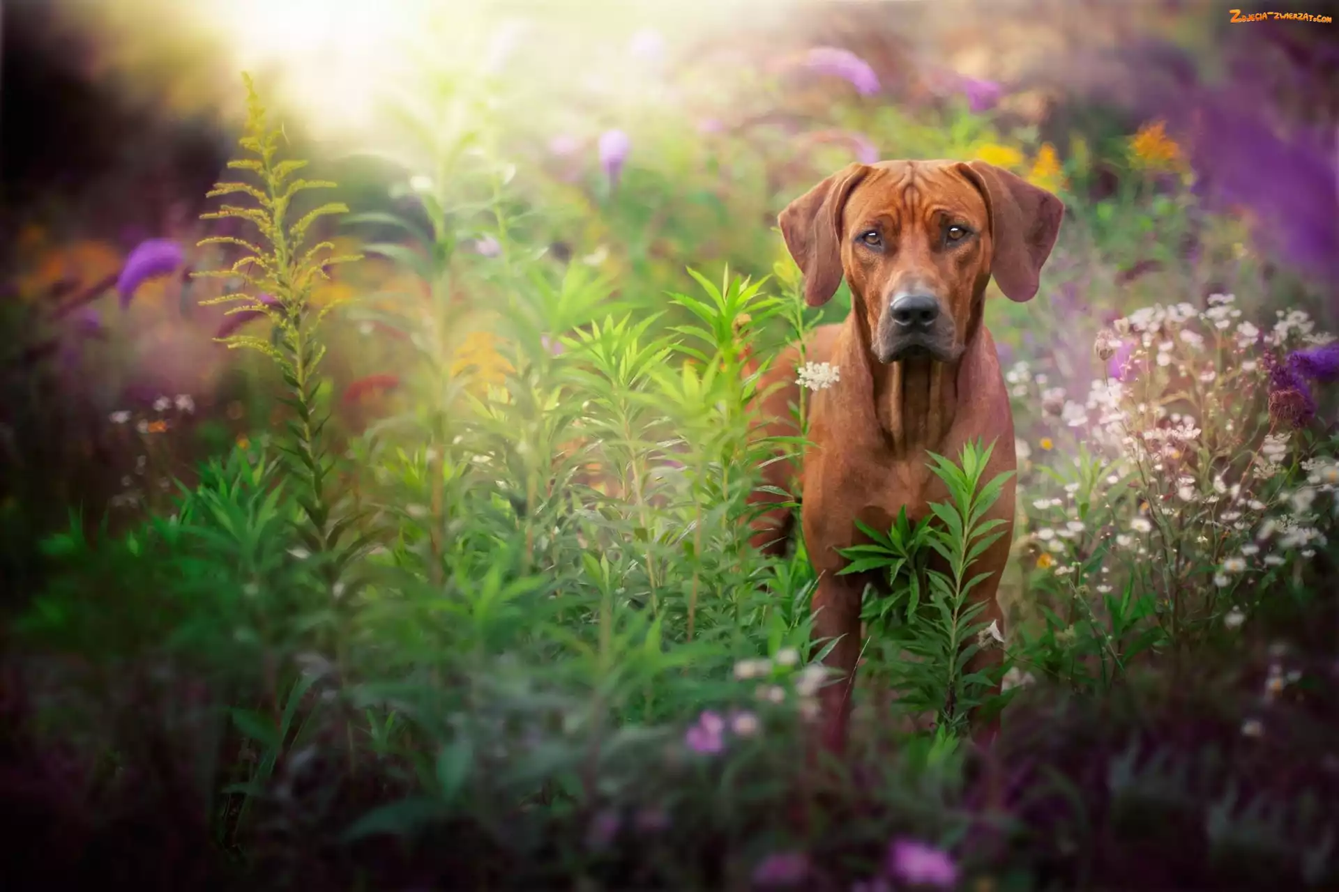 Zdjęcie: Rhodesian ridgeback, Łąka, Pies, Rośliny