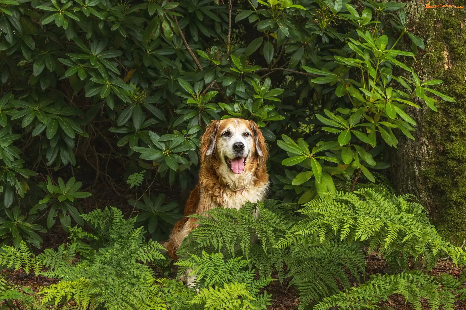 Zdjęcie: Rododendron, Pies, Paprocie