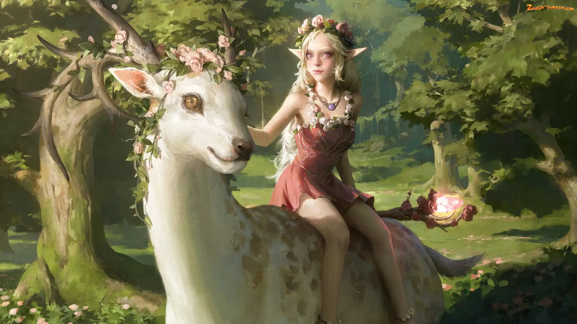Fantasy, Rogi, Grafika, Las, Elf, Jeleń, Biały, Dziewczyna