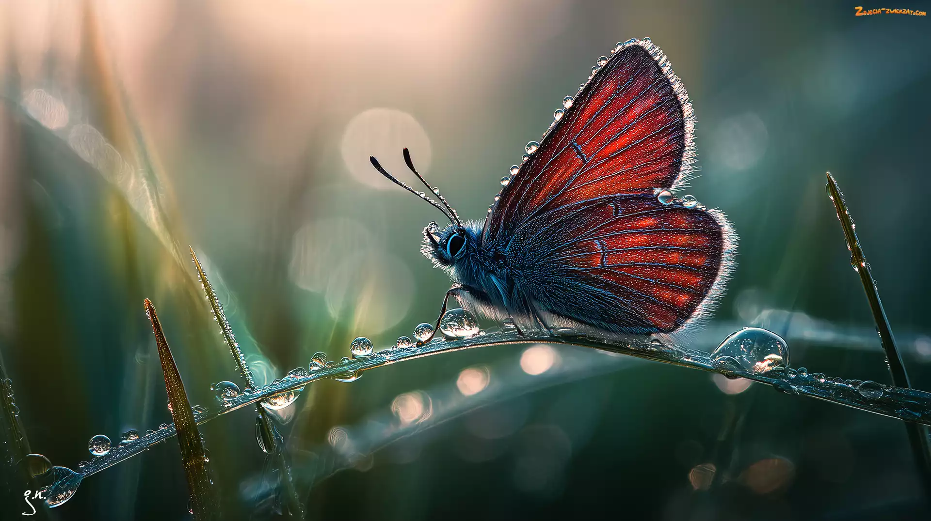 Zdjęcie: Krople, Motyl, Owad, Trawa, Grafika AI, Źdźbło, Rosa