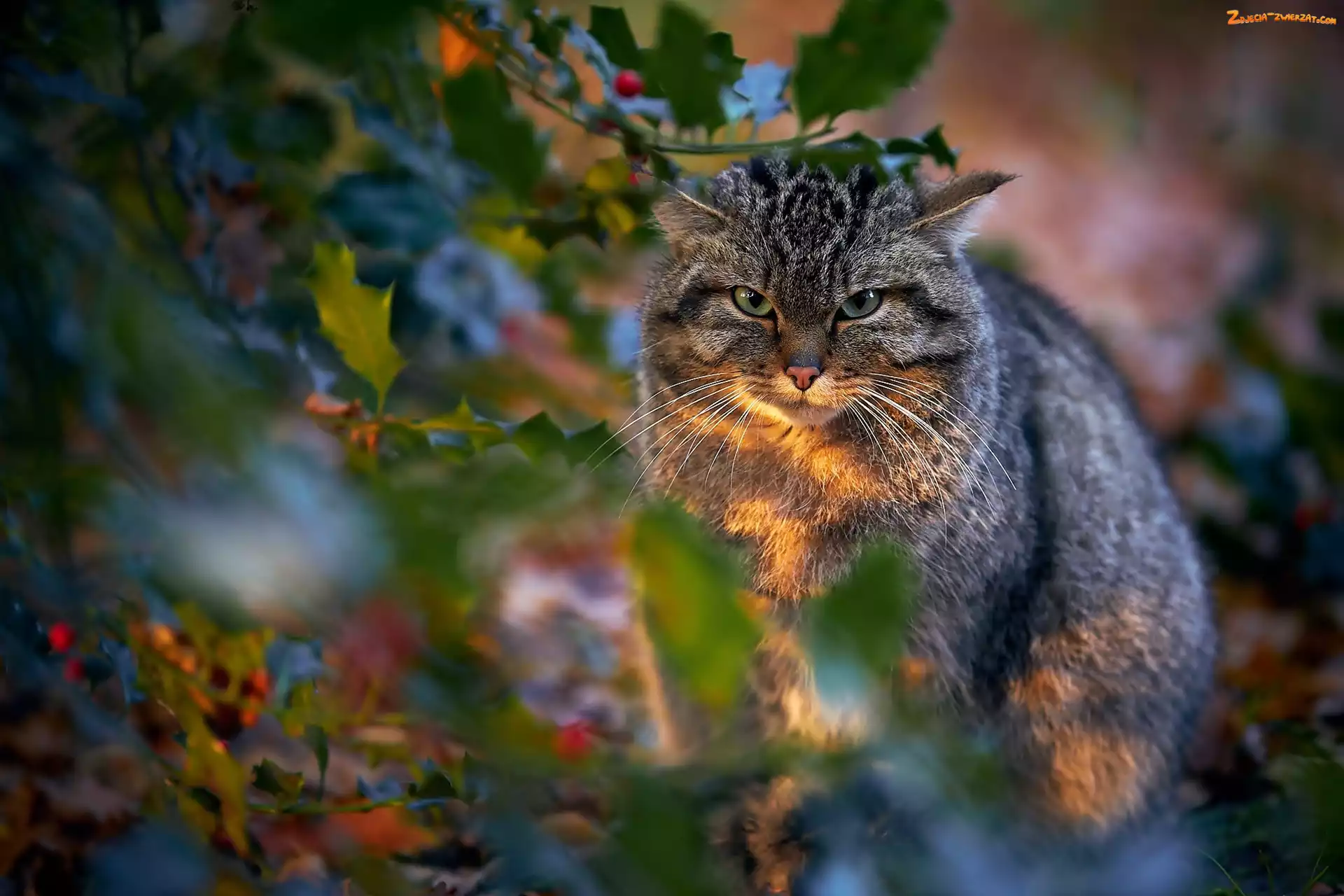 Zdjęcie: Rośliny, Rozmyte tło, Kot, Ostrokrzew
