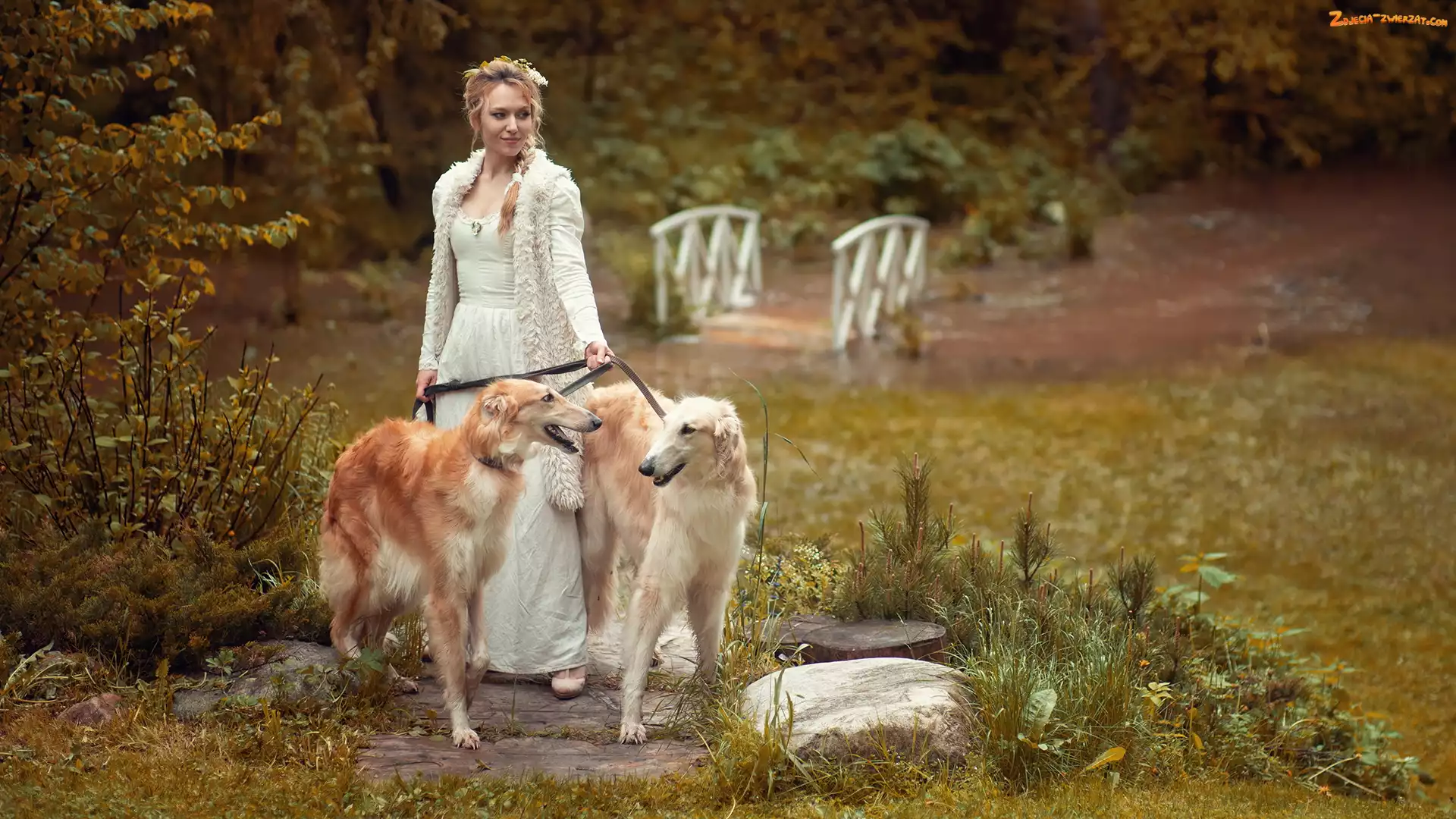 Zdjęcie: Charty rosyjskie borzoj, Psy, Blondynka, Kobieta, Dwa