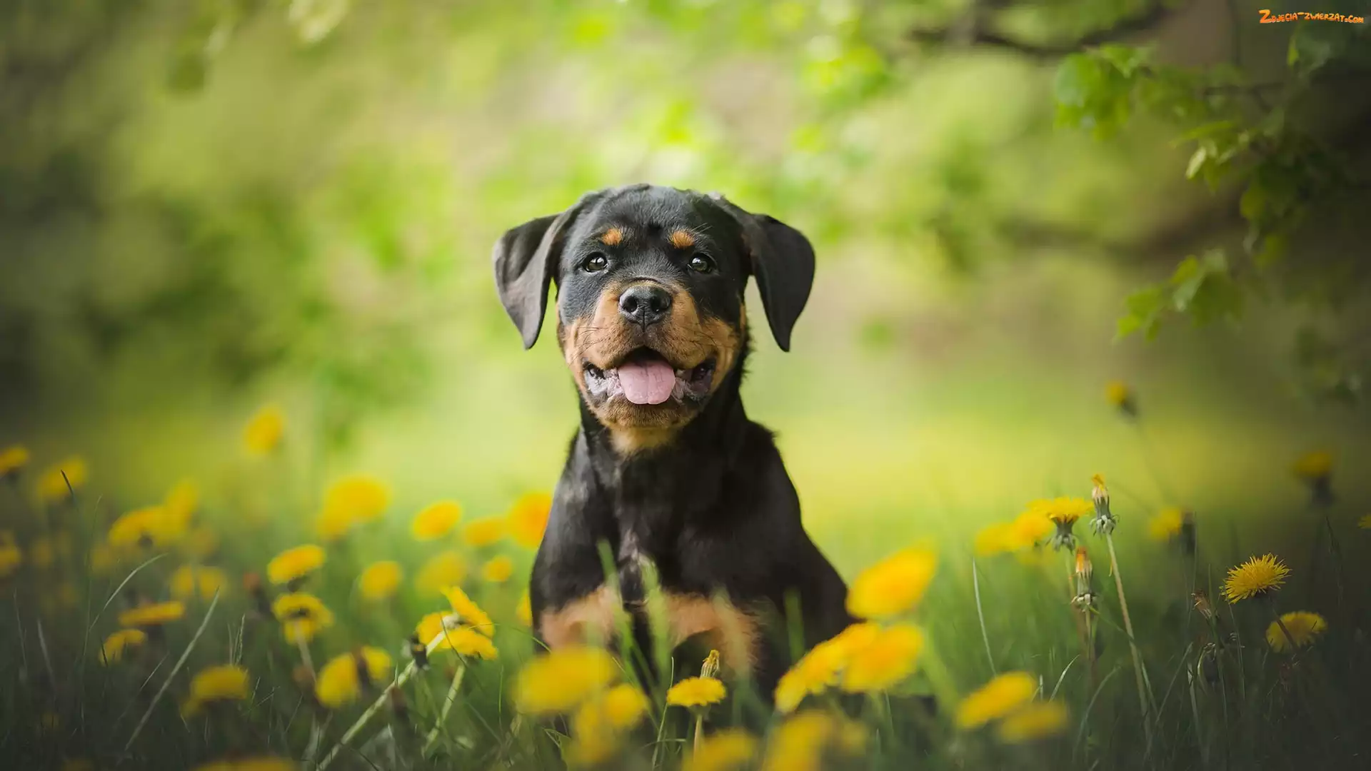 Zdjęcie: Rottweiler, Mniszek pospolity, Szczeniak, Łąka