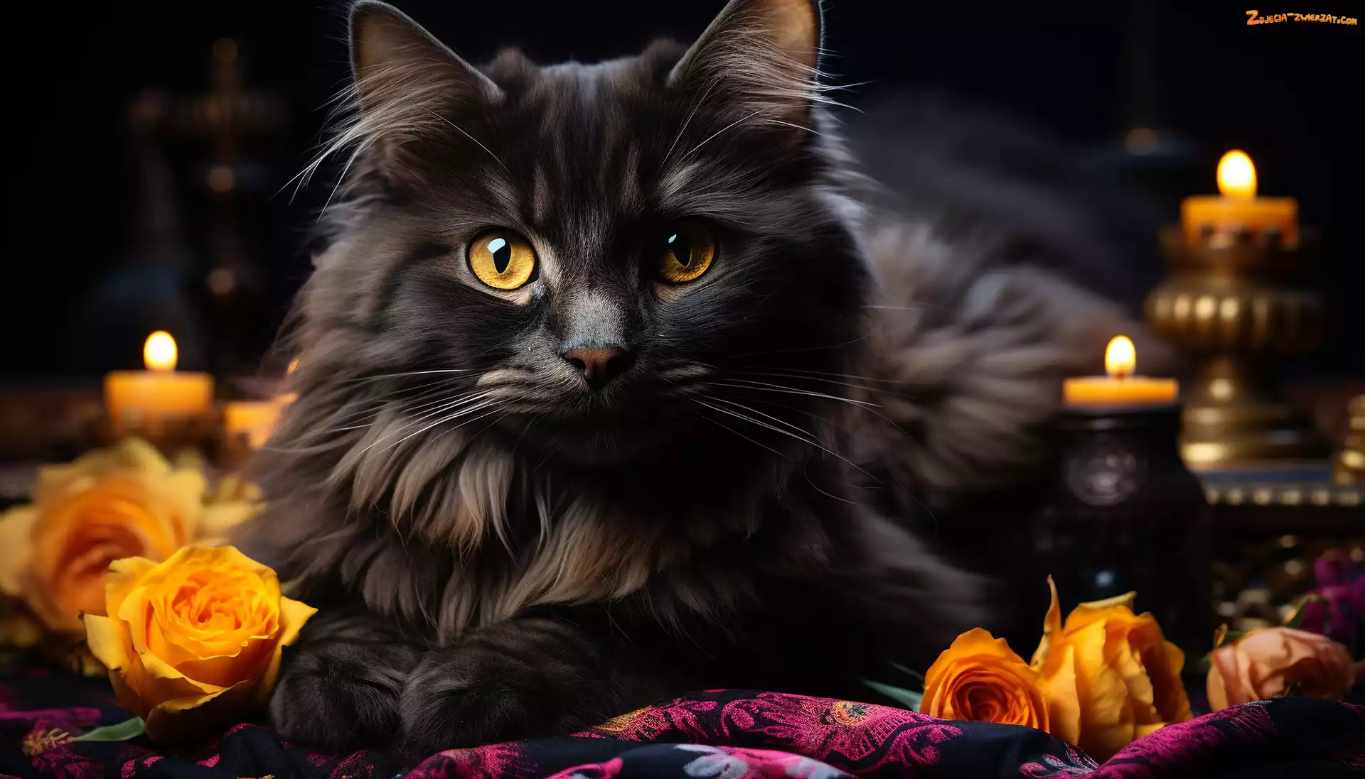 Zdjęcie: Świece, Róże, Grafika, Czarny, Kot