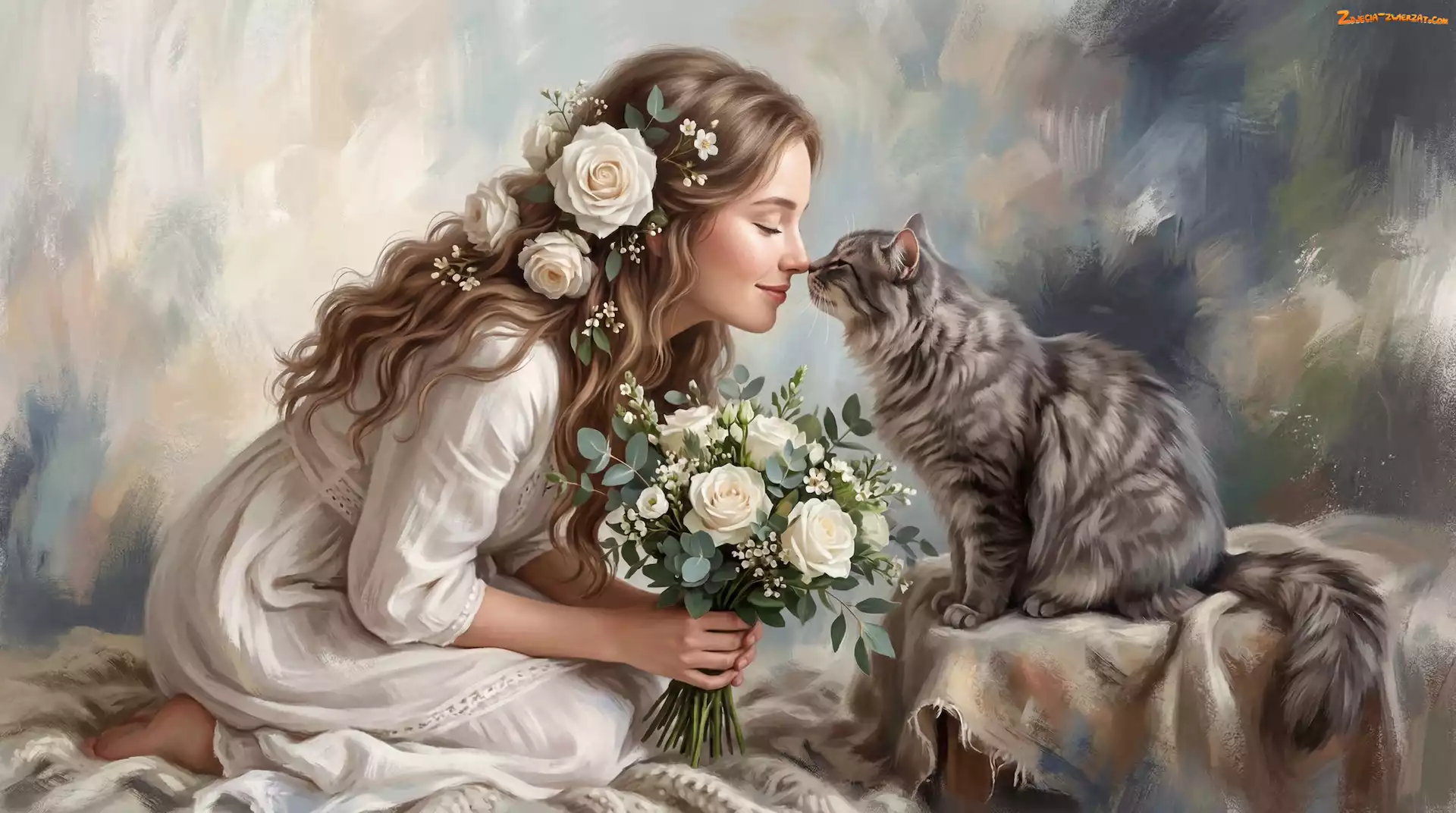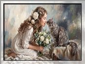 Kot, Róże, Grafika, Dziewczyna, Kwiaty
