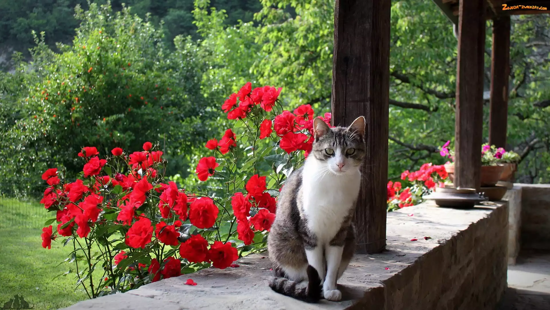 Zdjęcie: Róże, Kwiaty, Murek, Kot, Ogród