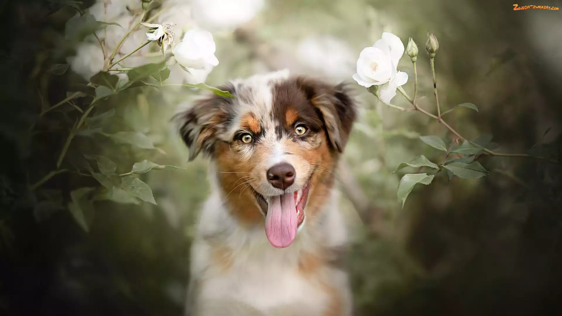 Zdjęcie: Róże, Białe, Owczarek australijski, Pies, Jęzor