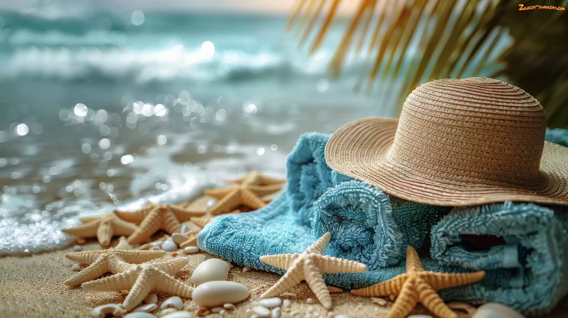 Zdjęcie: Muszelki, Plaża, Kapelusz, Rozgwiazdy, Kompozycja, Ręcznik, Morze