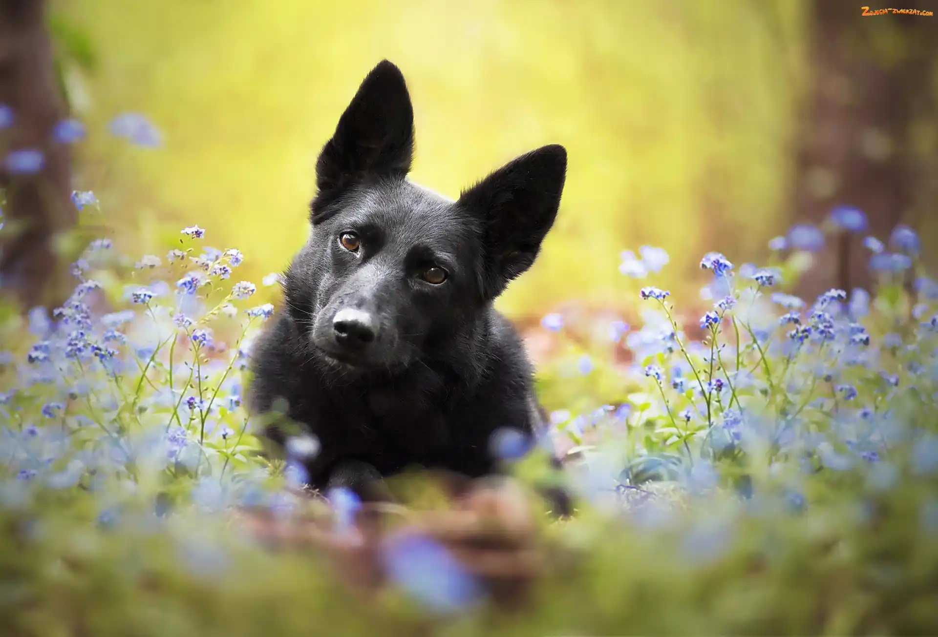 Rozmycie, Niezapominajki, Pies, Czarny, Kwiaty