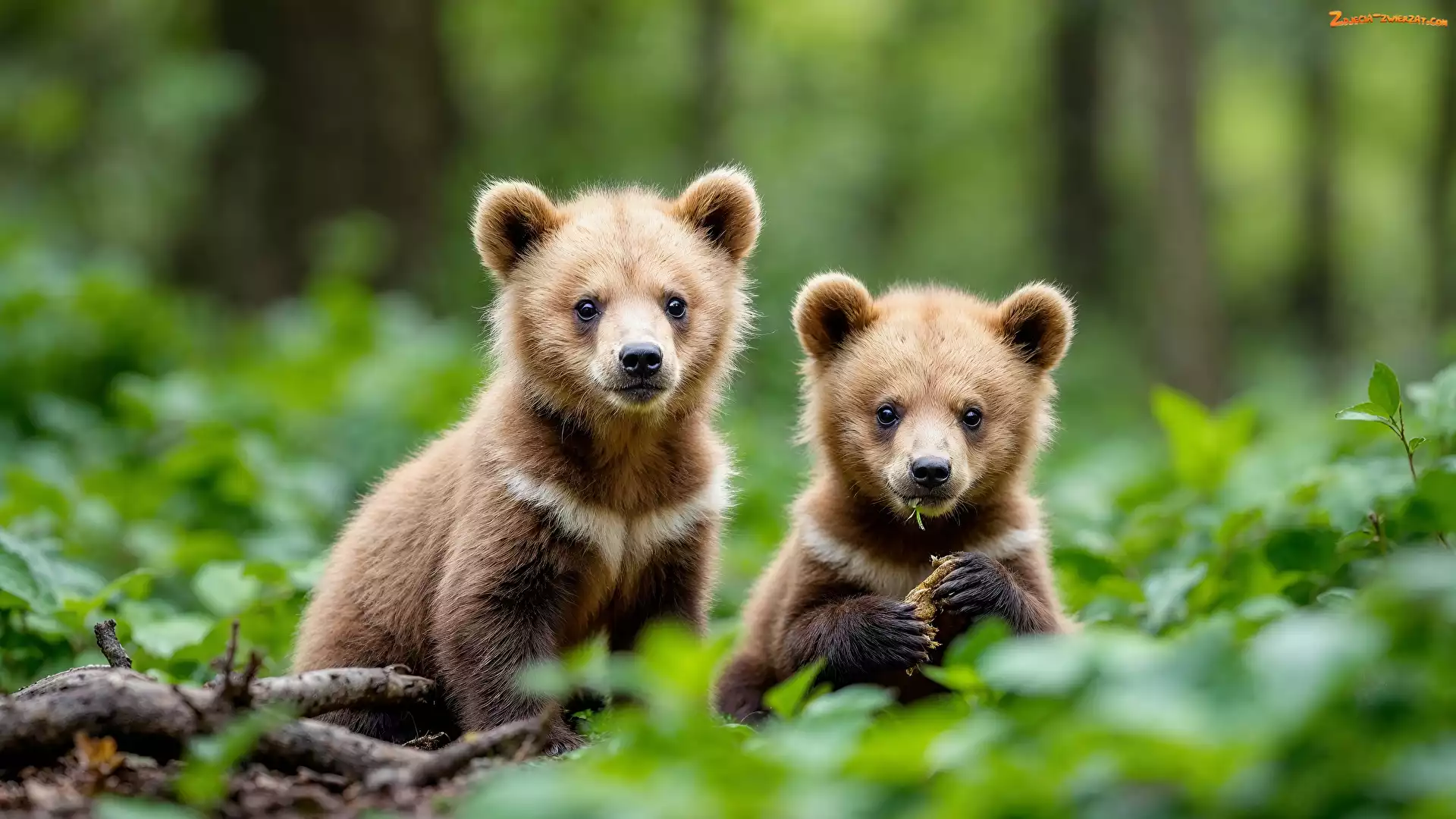 Zdjęcie: Dwa, Niedźwiadki brunatne, Rozmyte tło, Liście