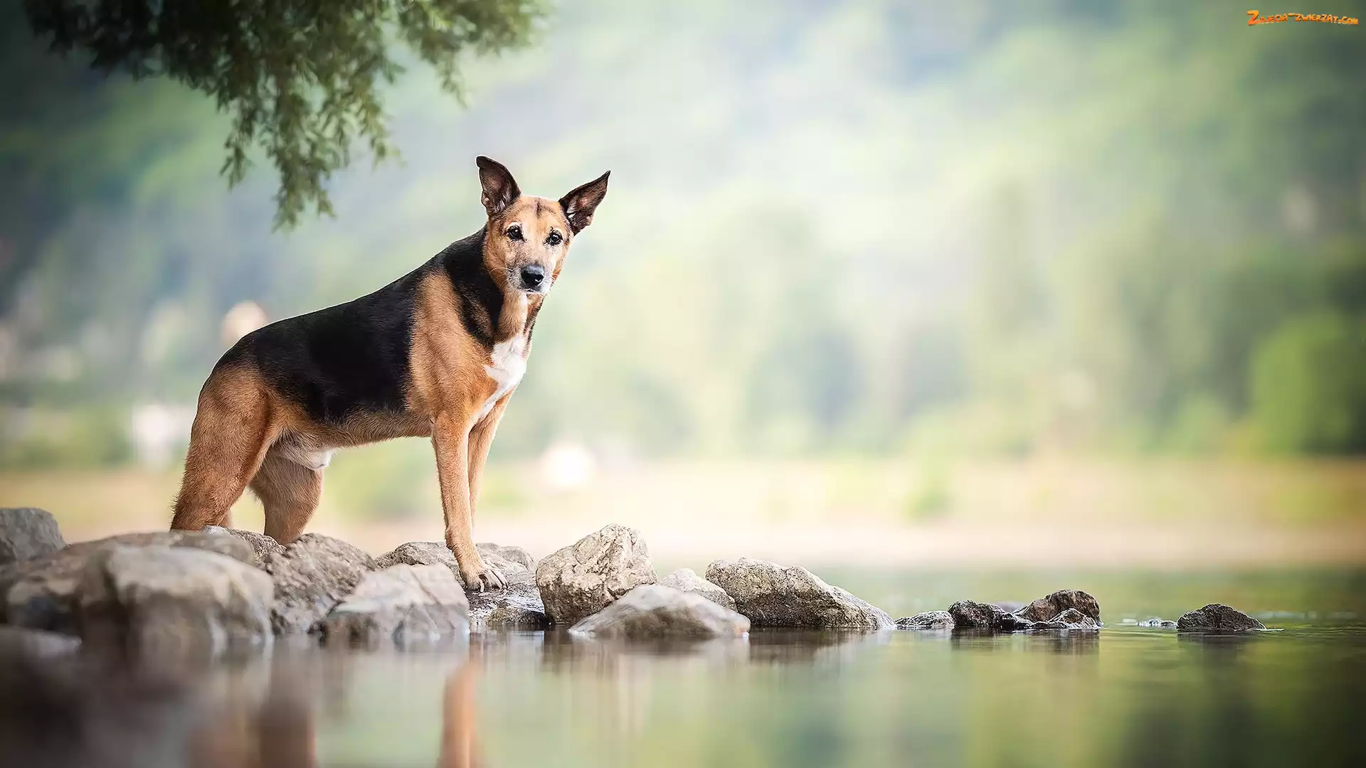 Zdjęcie: Rozmyte tło, Woda, Kamienie, Pies, Rośliny