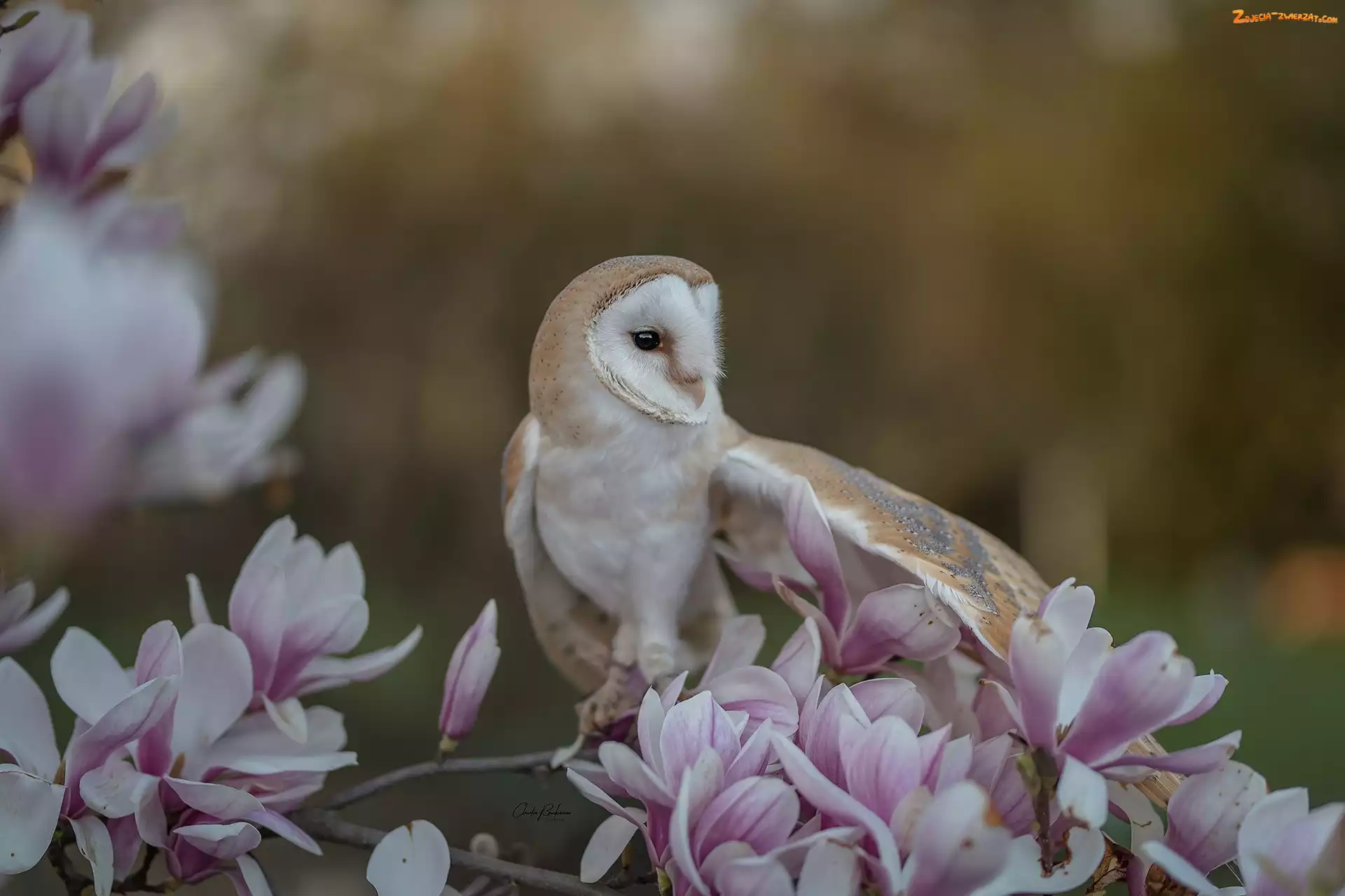 Rozmyte tło, Magnolia, Płomykówka, Sowa, Gałąź