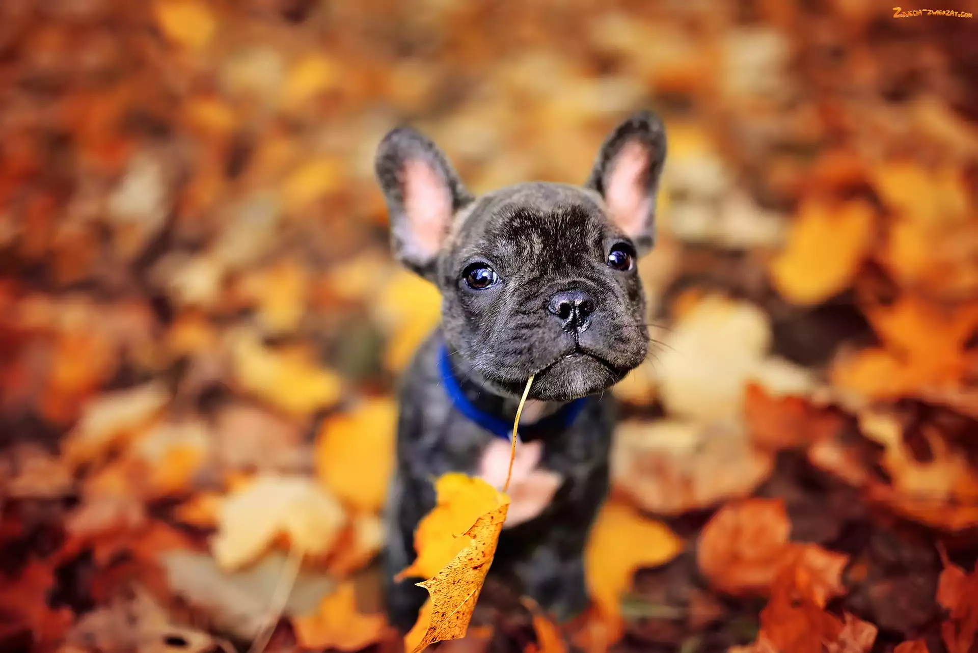 Tło rozmyte, Szczeniak, Pies, Liście, Buldog francuski