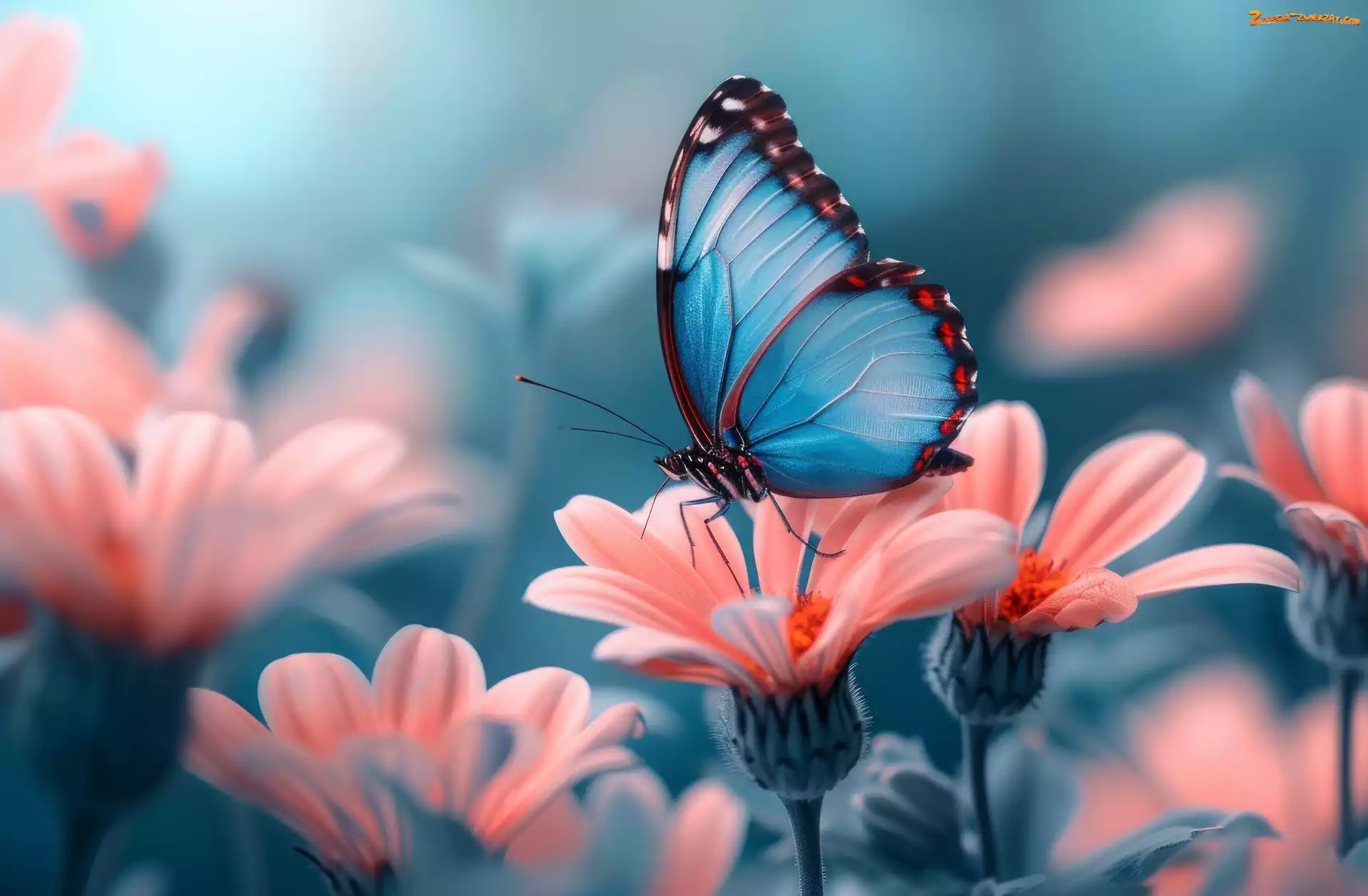 Zdjęcie: Kwiaty, Różowe, Grafika, Niebieski, Motyl