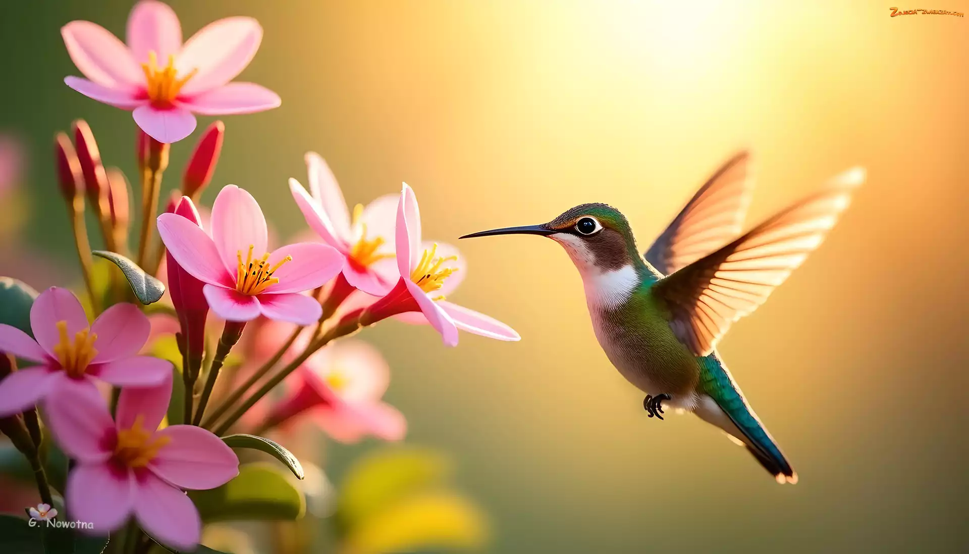Zdjęcie: Kwiaty, Różowe, Grafika, Koliber, Ptak