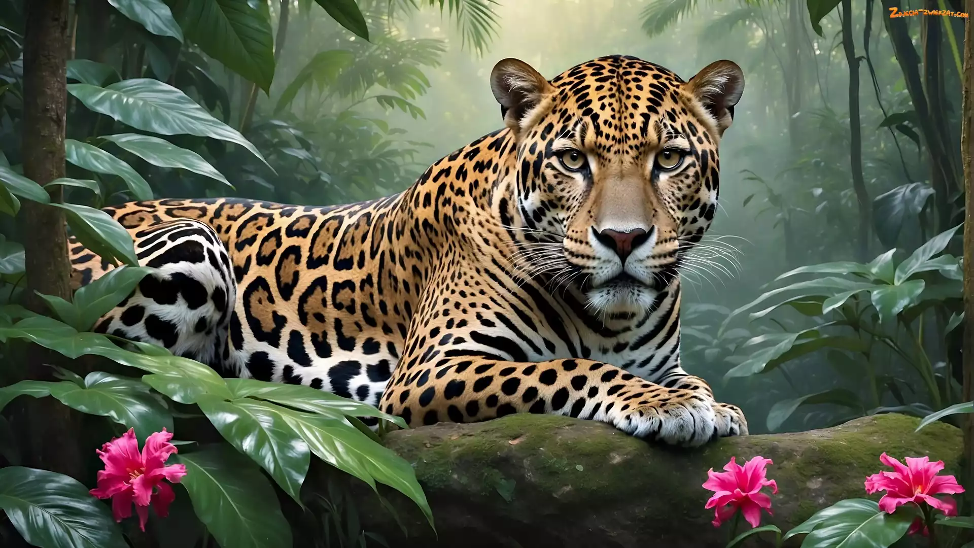 Zdjęcie: Kwiaty, Leżący, Jaguar, Różowe, 2D, Kłoda, Liście