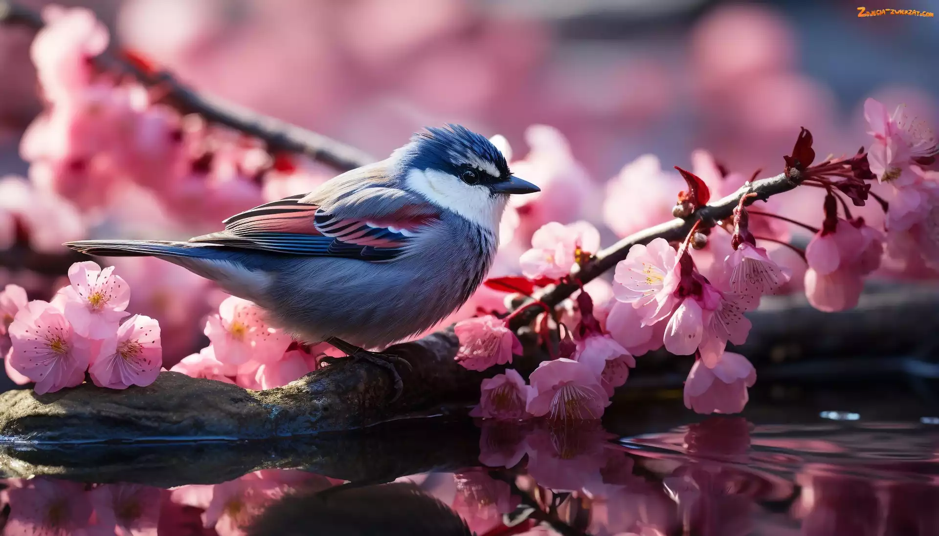 Zdjęcie: Kwiaty, Różowe, Woda, Ptak, Gałązki