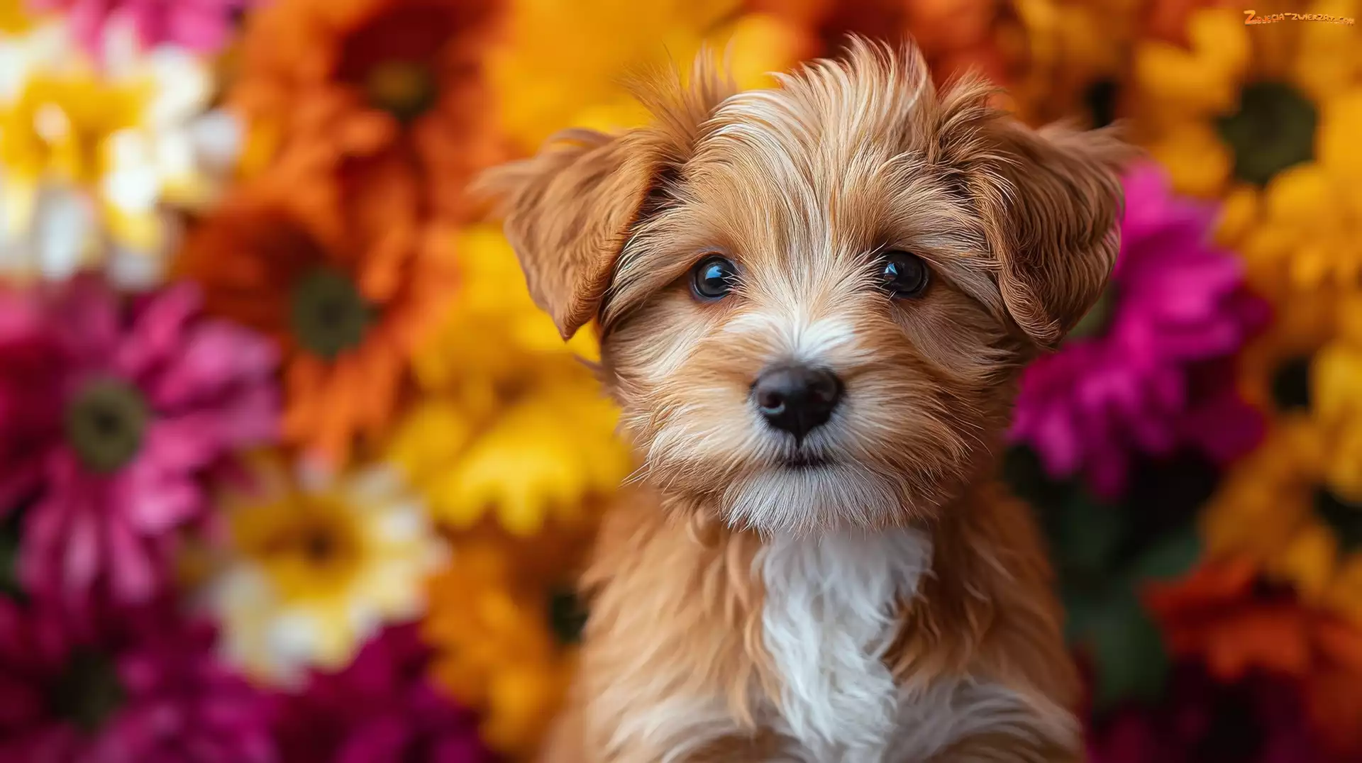 Zdjęcie: Pies, Rudo-biały, Kwiaty, Szczeniak