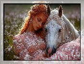 Zdjęcie: Koń, Kobieta, Śpiąca, Rudowłosa, Łąka, Biały