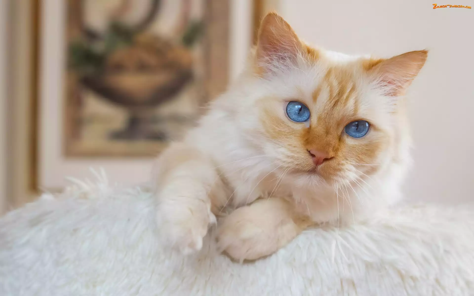 Zdjęcie: Biało-rudy, Kot, Zbliżenie, Koc
