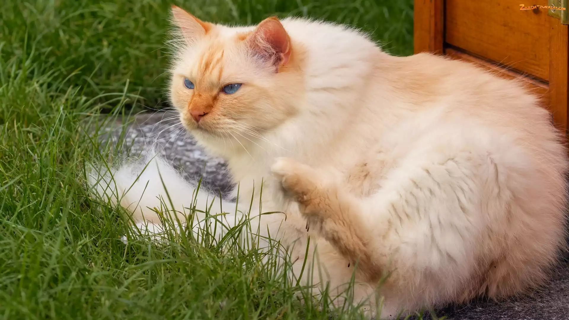 Zdjęcie: Biało-rudy, Kot, Drzwi, Ogród