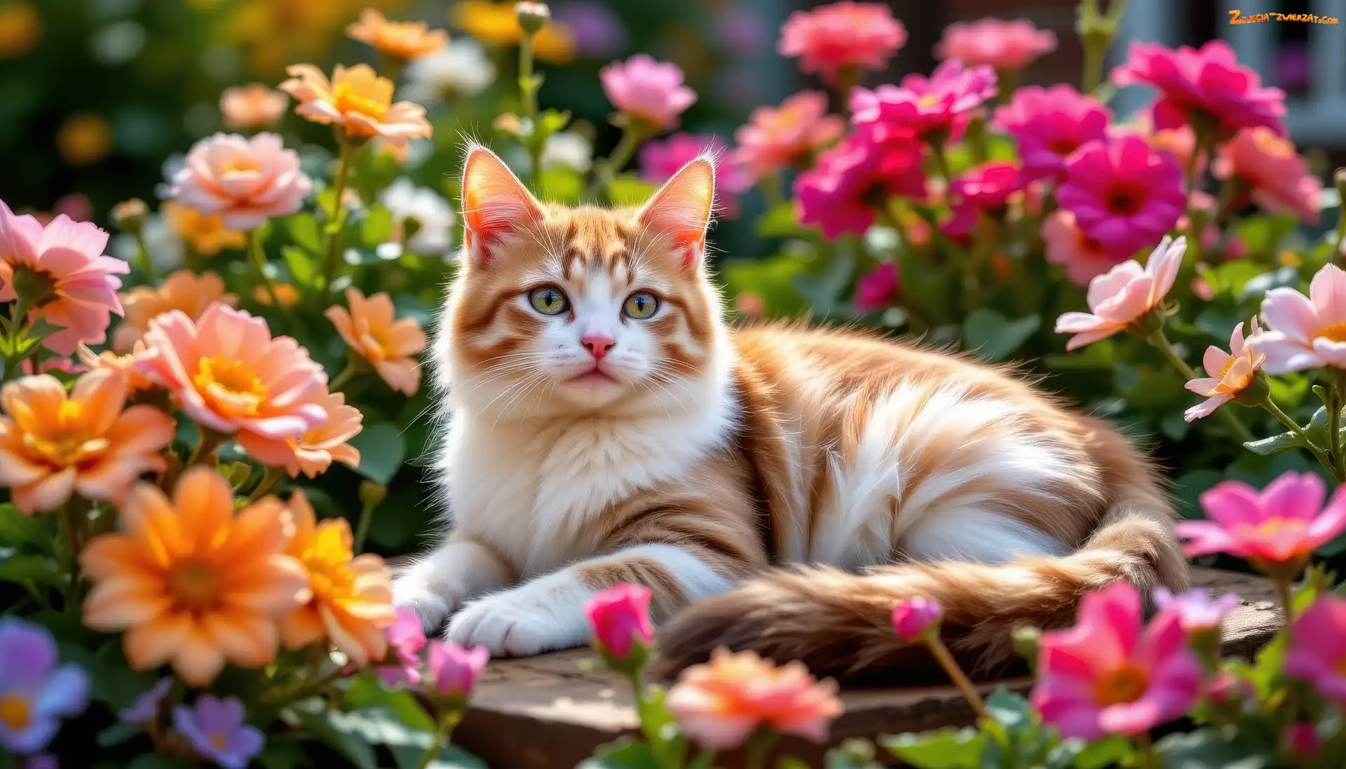 Zdjęcie: Biało-rudy, Kot, Kwiaty, Spojrzenie