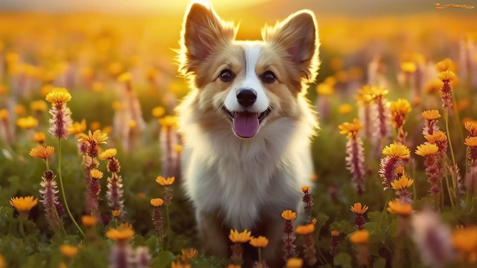 Zdjęcie: Kwiaty, Pies, Biało-rudy