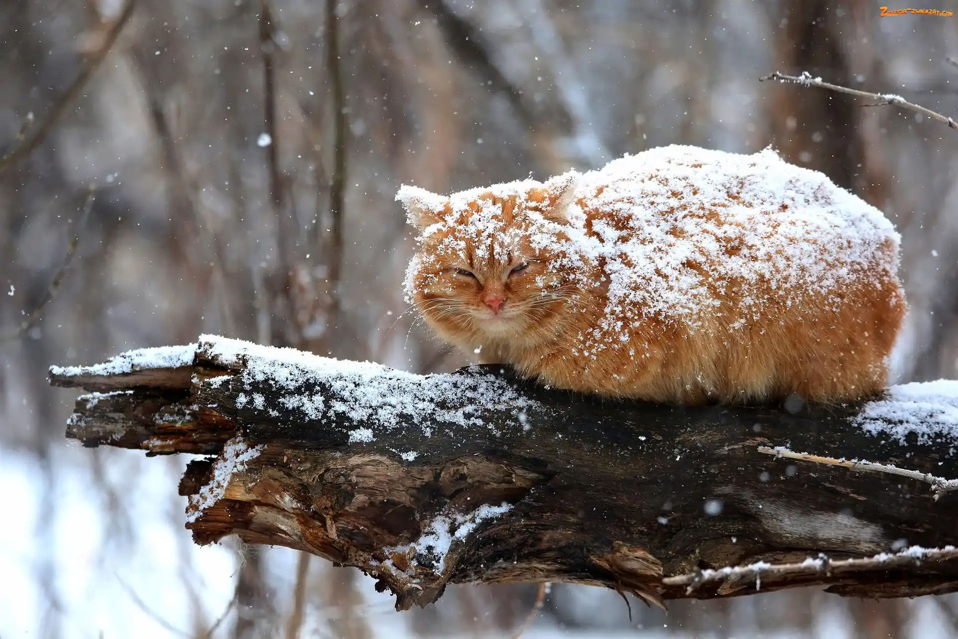 Zdjęcie: Rudy, Przyprószony, Śnieg, Gałąź, Śniegiem, Kot