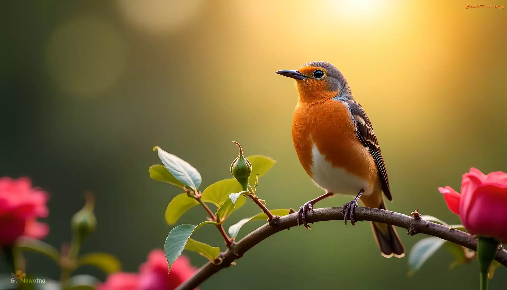 Zdjęcie: Grafika AI, Rudzik, Rudy, Ptak, Gałązka, Róża