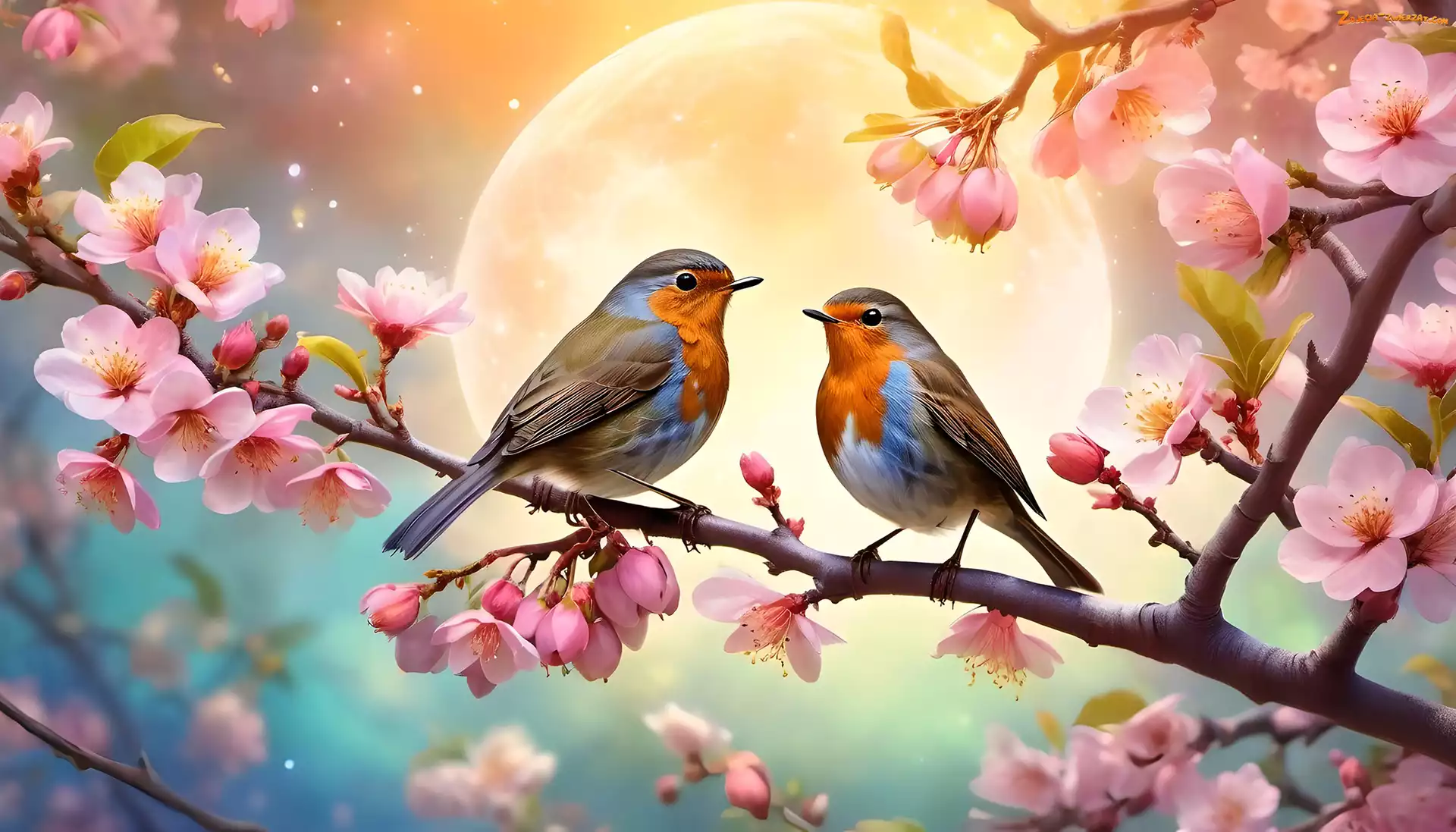 Zdjęcie: Kwiaty, Ptaki, Dwa, Rudziki, Gałązka, Różowe