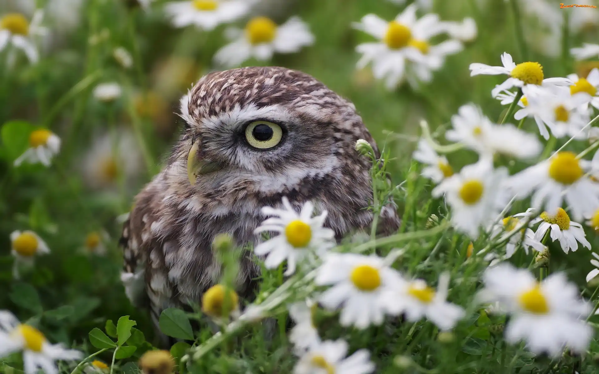Zdjęcie: Rumianek, Kwiaty, Sowa, Ptak, Pójdźka zwyczajna