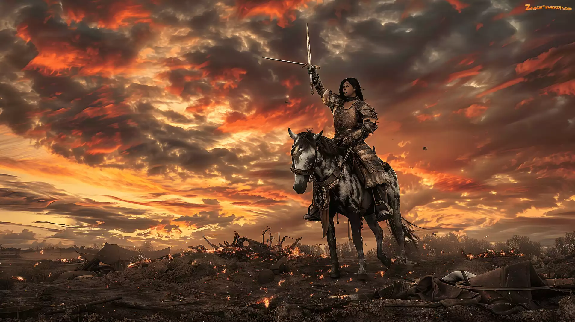 Zdjęcie: Miecz, Koń, Zgliszcza, Grafika, Chmury, Kobieta, Wojowniczka, Rycerz