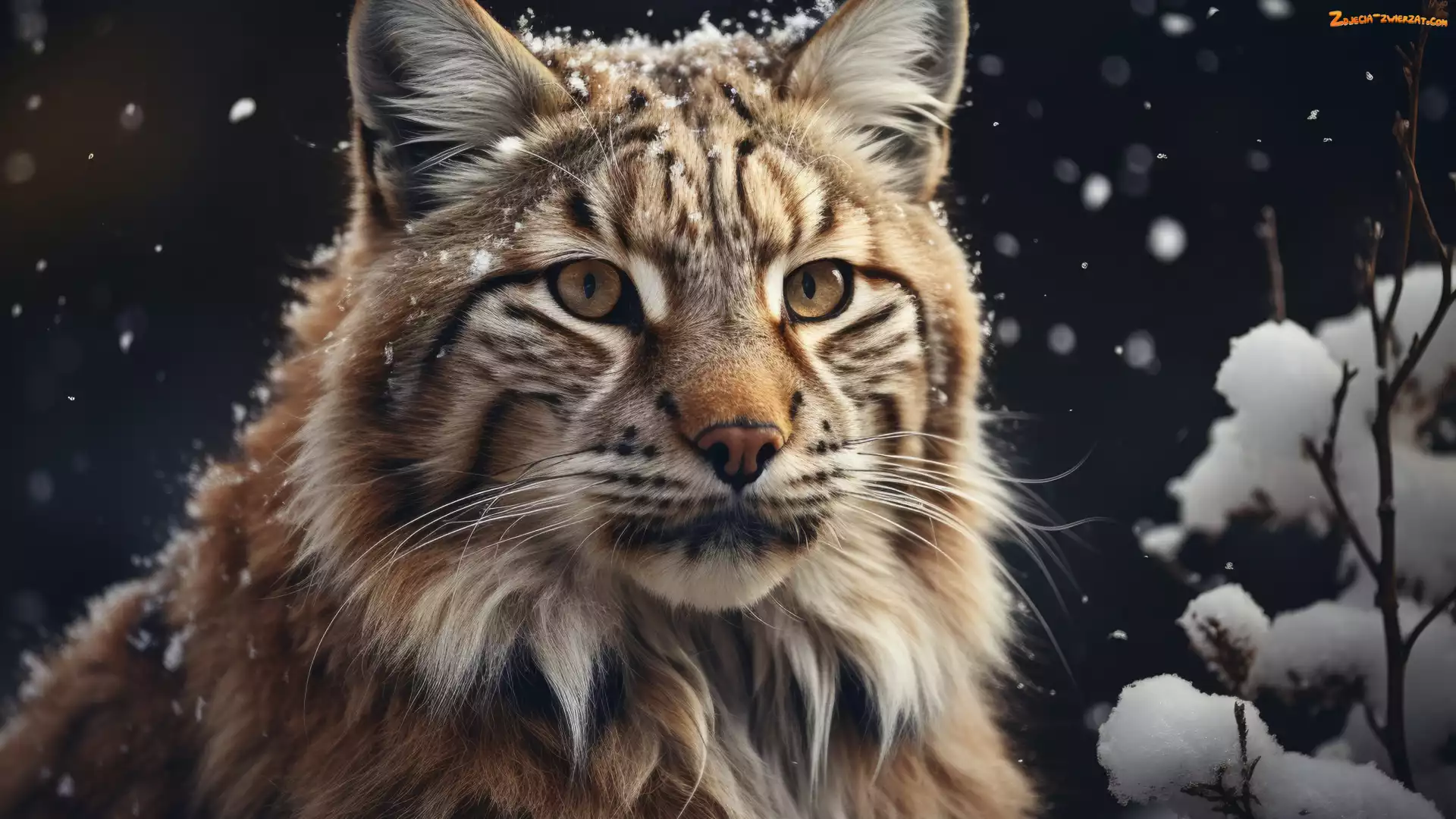 Śnieg, Głowa, Zima, Ryś, Spojrzenie, Gałązki