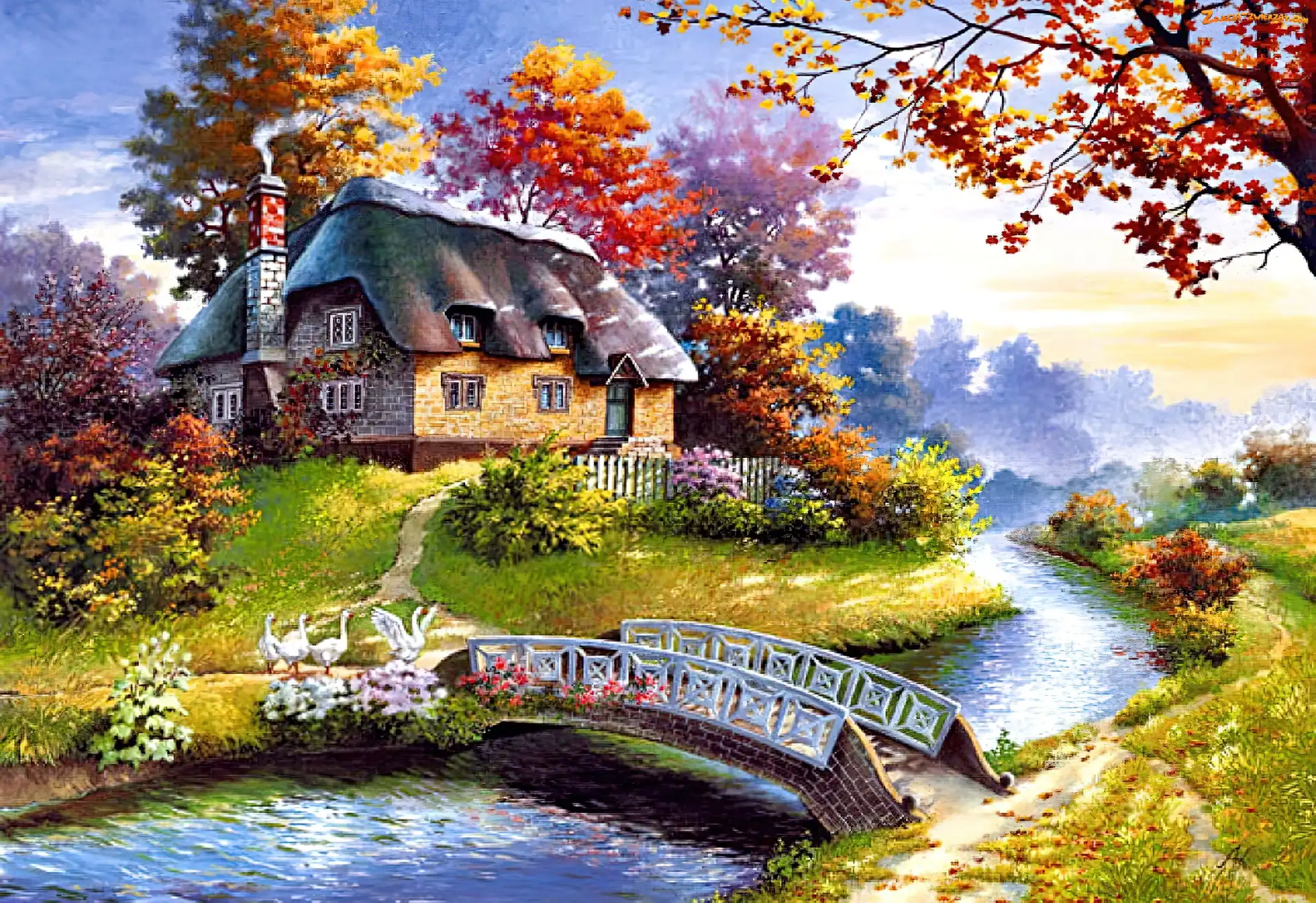 Zdjęcie: Rzeka, Gęsi, Dom, Mostek